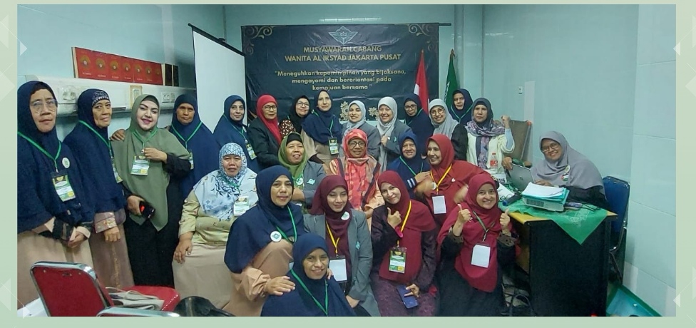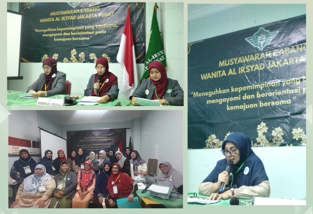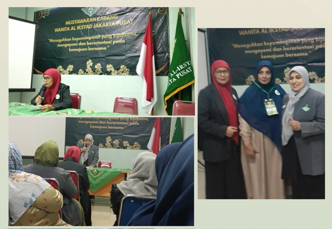 Alhamdulillah pada hari Jum'at 5 Rabiul Awal 1447H / 29 Agustus 2025,PCW Wanita Al-Irsyad Jakarta Pusat telah menyelenggarakan Musyawarah Cabang untuk memilih kepengurusan baru periode 2025-2030. Musyawarah ini bertema Meneguhkan kepemimpinan yang bijaksana, mengayomi dan berorientasi pada kemajuan bersama. Dalam Muscab ini telah terpilih Ibu Widad Alkatiri sebagai ketua pengurus yang baru. Semoga Allah SWT selalu meridhoi setiap langkah pengurus cabang Wanita Al-Irsyad Jakarta Pusat dalam menjalankan tanggung jawabnya.